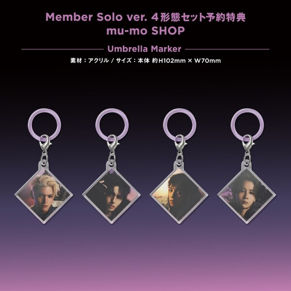 ● mu-mo SHOP ・・Member Solo ver. ... 4-type set pre-order bonus: Umbrella marker (set of 4) *Please note that this offer is only available if you pre-order all four types at the same time.