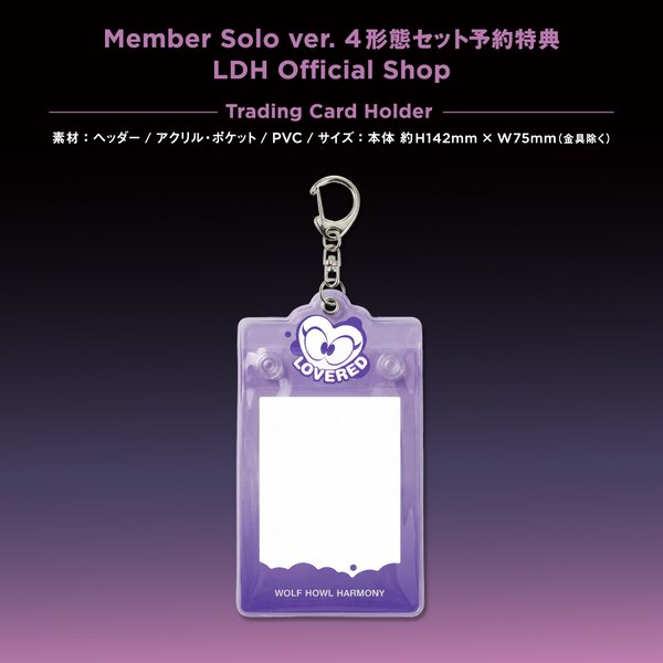 ●LDH Official Shop: ・・Member Solo ver. ... Single item pre-order bonus: 1 clear trading card (member of your choice) *The design is of the member who purchased it. ... 4-piece set pre-order bonus: Trading card holder (1 type/LOVERED design) *Please note that this offer is only available if you pre-order all four types at the same time.