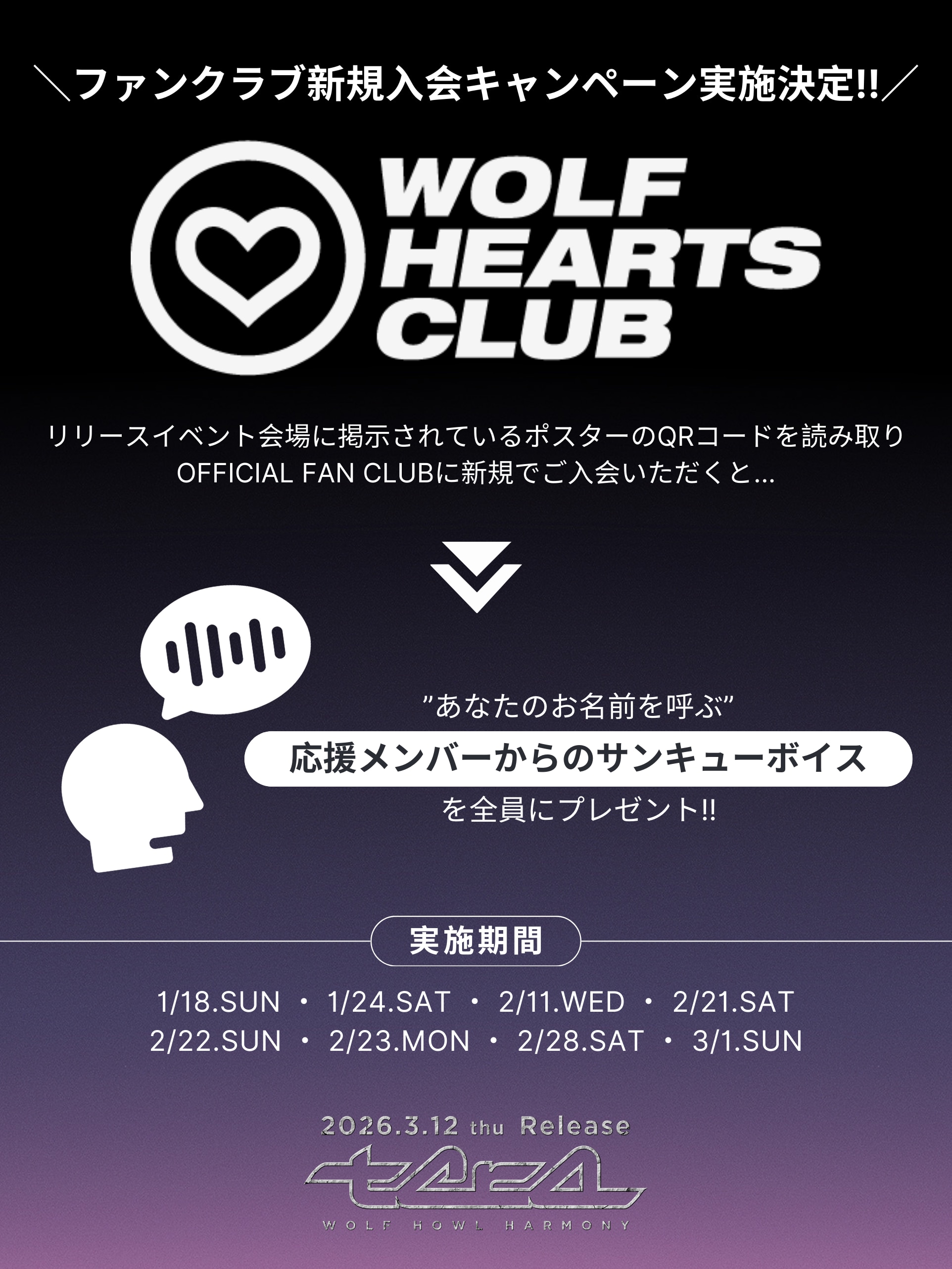 WOLF HOWL HARMONY 1st EP『tera』発売記念リリースイベント”WOLF HEARTS CLUB”会場限定ファンクラブ新規入会キャンペーンの実施が決定しました!